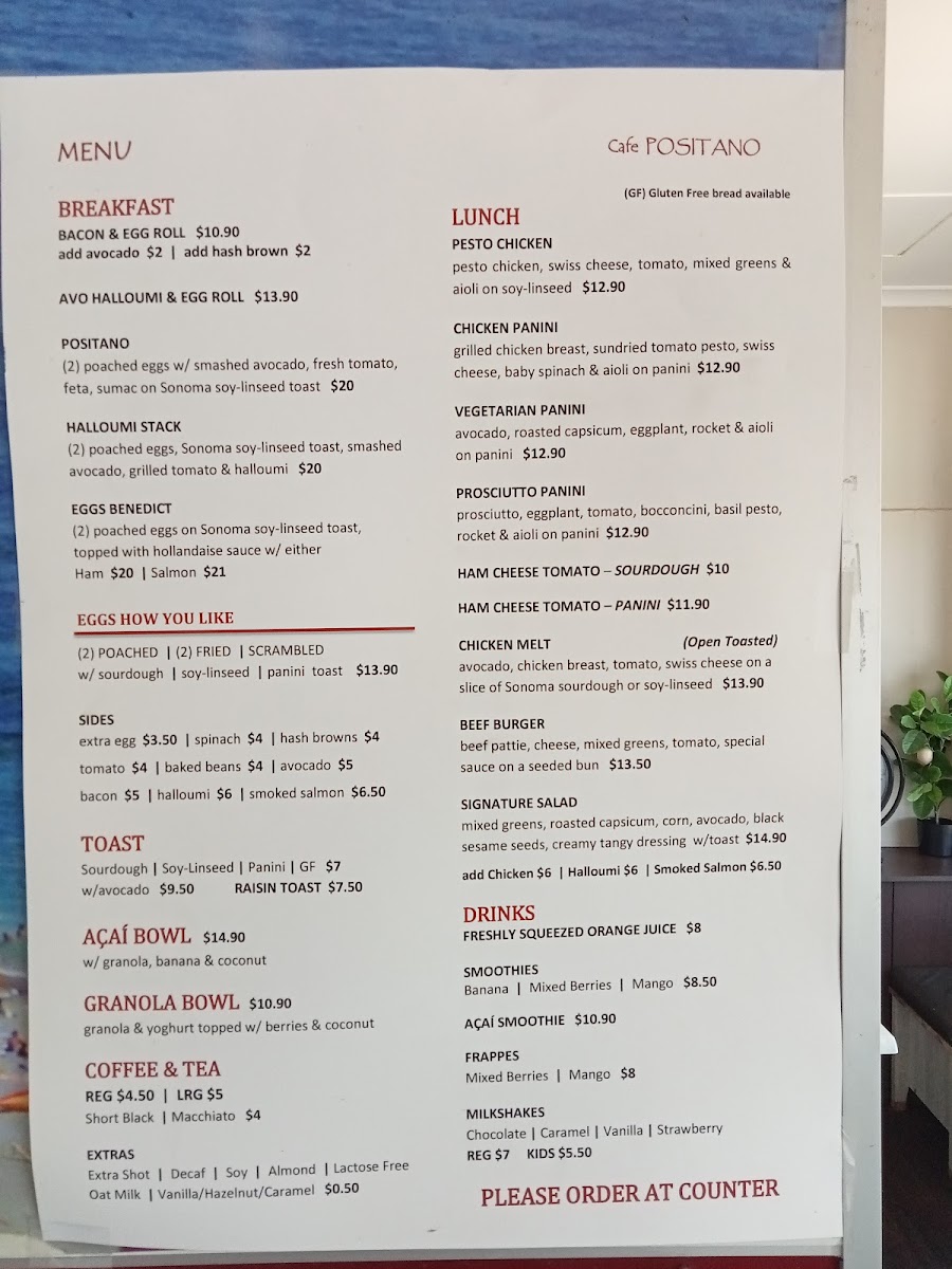 Cafe Positano's menu offers a delightful variety of dishes perfect for any time of the day. For breakfast, guests can indulge in options like the Bacon & Egg Roll or the more indulgent Positano Big Breakfast. Those looking for something light can enjoy the Eggs Benedict or the Avo Halloumi & Egg Roll. A range of sides is also available, including Extra Egg, Bacon, and Halloumi. The breakfast selection is complemented by a variety of toast options like Sourdough, Raisin Toast, and Gluten-Free Bread. For a satisfying start to the day, the Açaí Bowl is a refreshing choice. Lunch options include the Signature Salad, Chicken Panini, and the mouth-watering Chicken Melt (Open Toasted). For something sweet, the Granola Bowl offers a healthy option. The drink menu is equally diverse, with choices like the refreshing Açaí Smoothie, Frappés, Freshly Squeezed Orange Juice, and a range of Milkshakes. Coffee lovers can enjoy their favorite brew, from a Short Black to an Iced Matcha Latte or a comforting Chai Latte. Whether you're popping in for a quick coffee or enjoying a full meal, Cafe Positano’s menu is designed to cater to a variety of tastes and preferences.